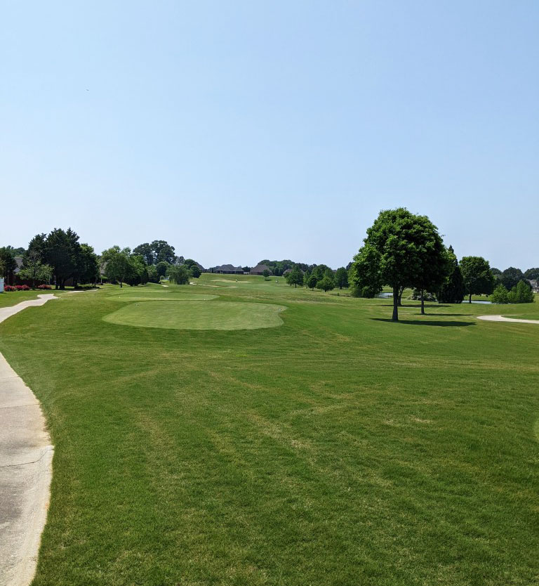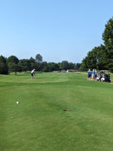 The longest hole on the course. A three-shot hole that doglegs right 100 yards from the green. The tee shot must be straight as a native area to the right almost assuredly means a lost ball. The second shot faces two bunkers guarding the right side of the fairway and a third on the left. The green is narrow with undulation and slopes from back to front.